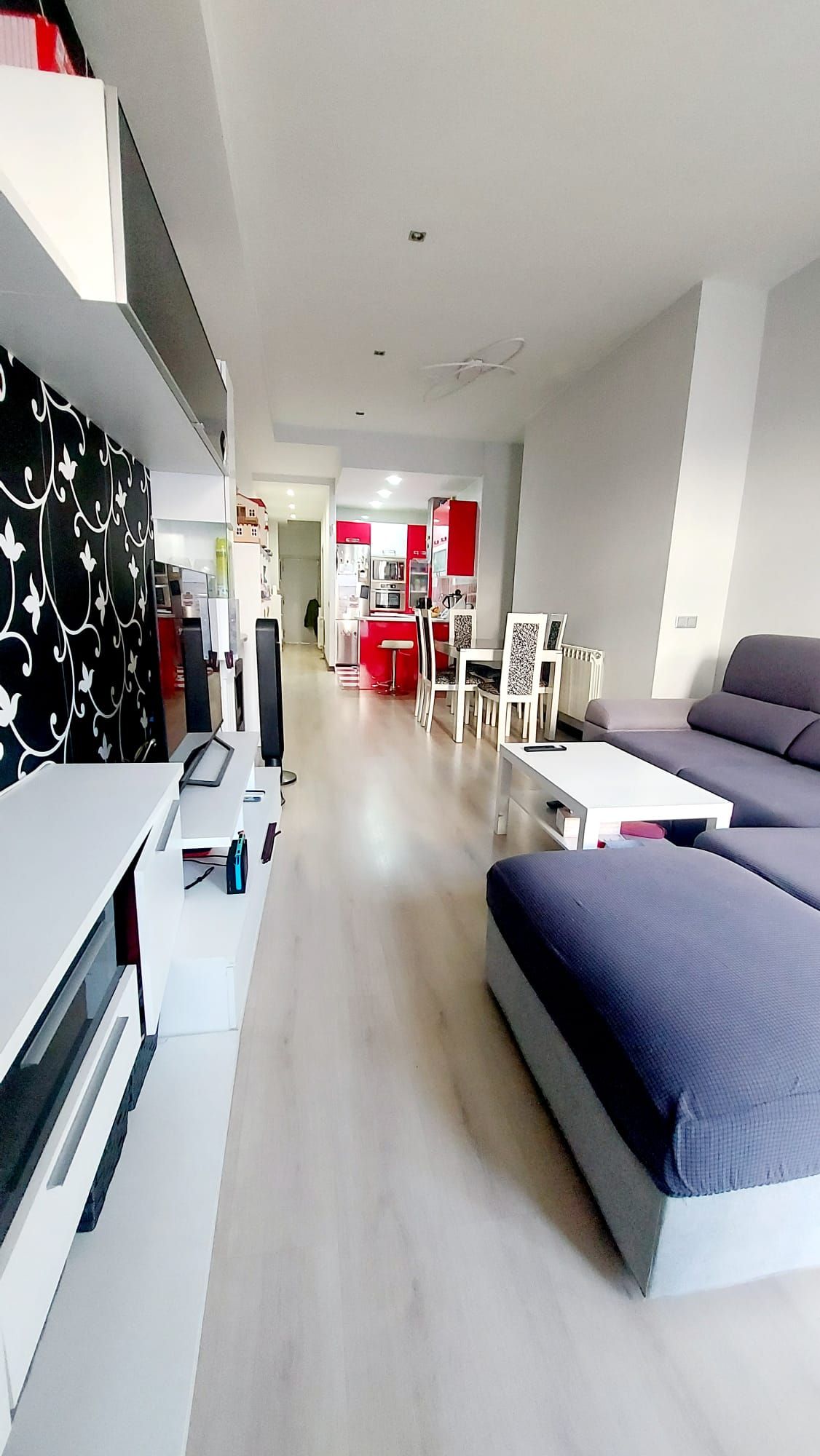 Seguido encontramos un amplio salón con cocina americana y gran ventanal con salida al patio.