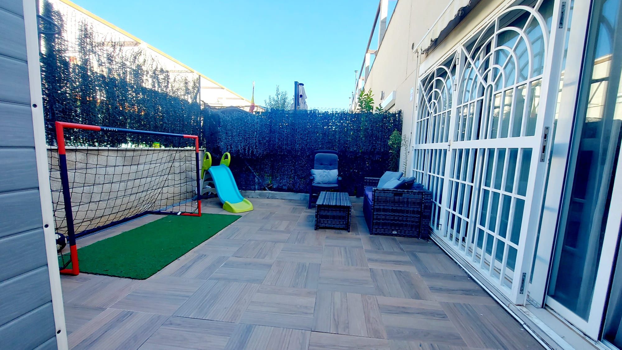 Distribuida con Tres dormitorios, baño, cocina americana y gran salón con salida a un patio solado de 26 metros