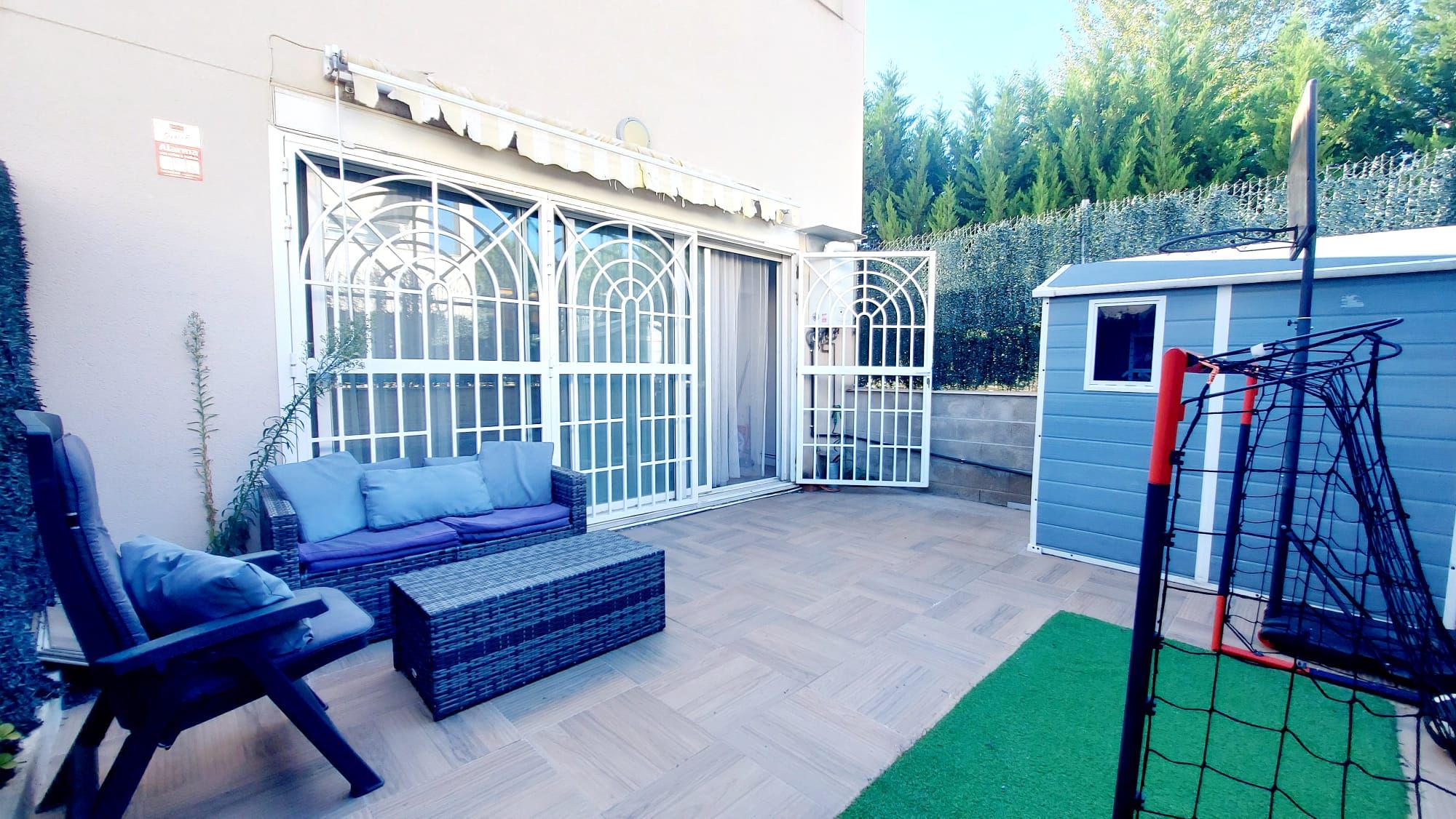 La carpintería exterior es de aluminio blanco corredera y persianas eléctricas automáticas, alarma, la carpintería interior de madera, suelos tarima, la vivienda dispone de aparatos de aire acondicionado con bomba de frio/calor, plaza de garaje en la puerta de la propiedad.