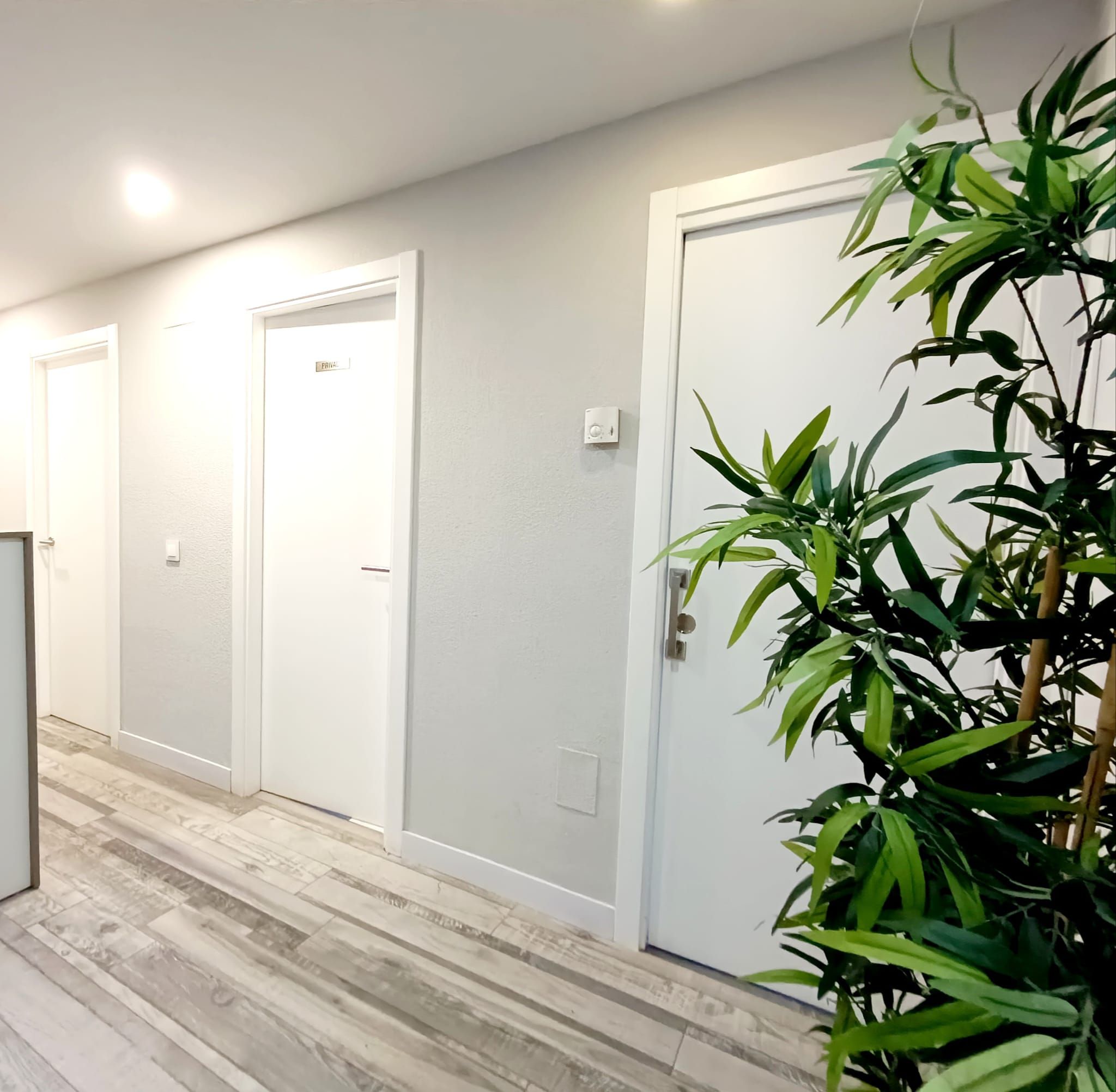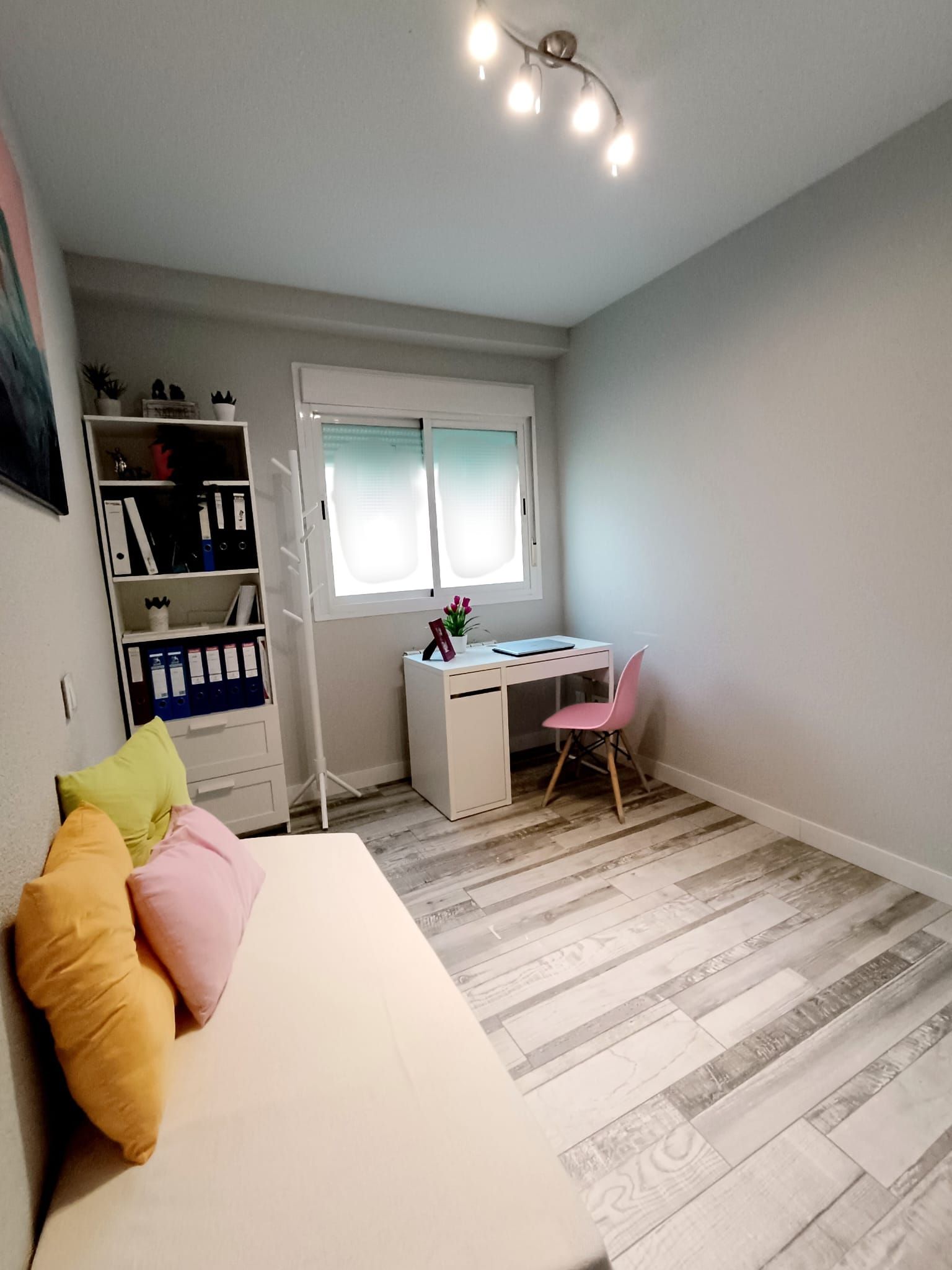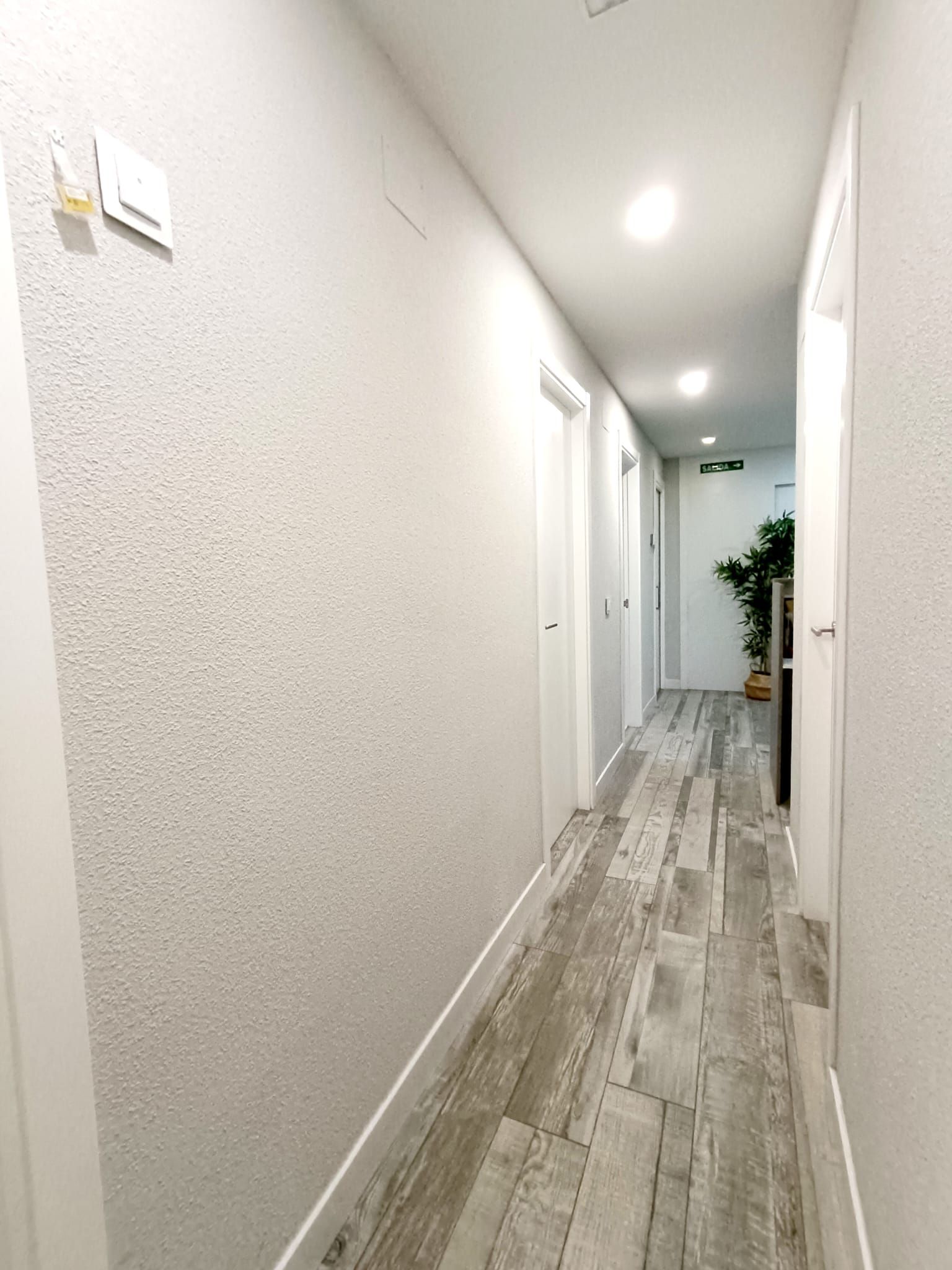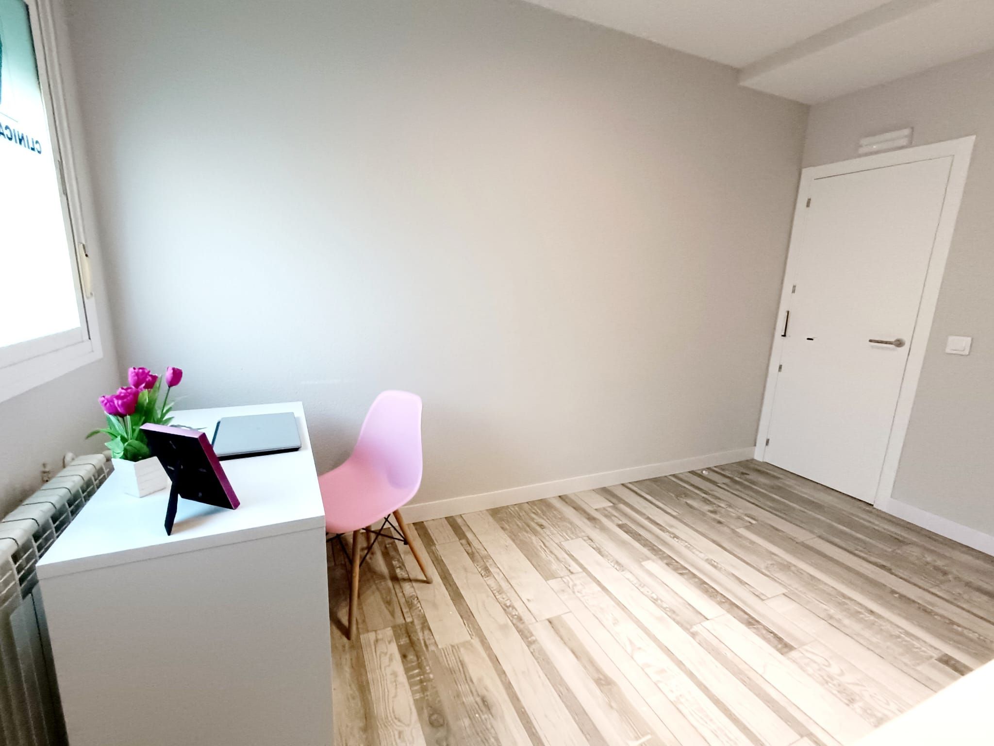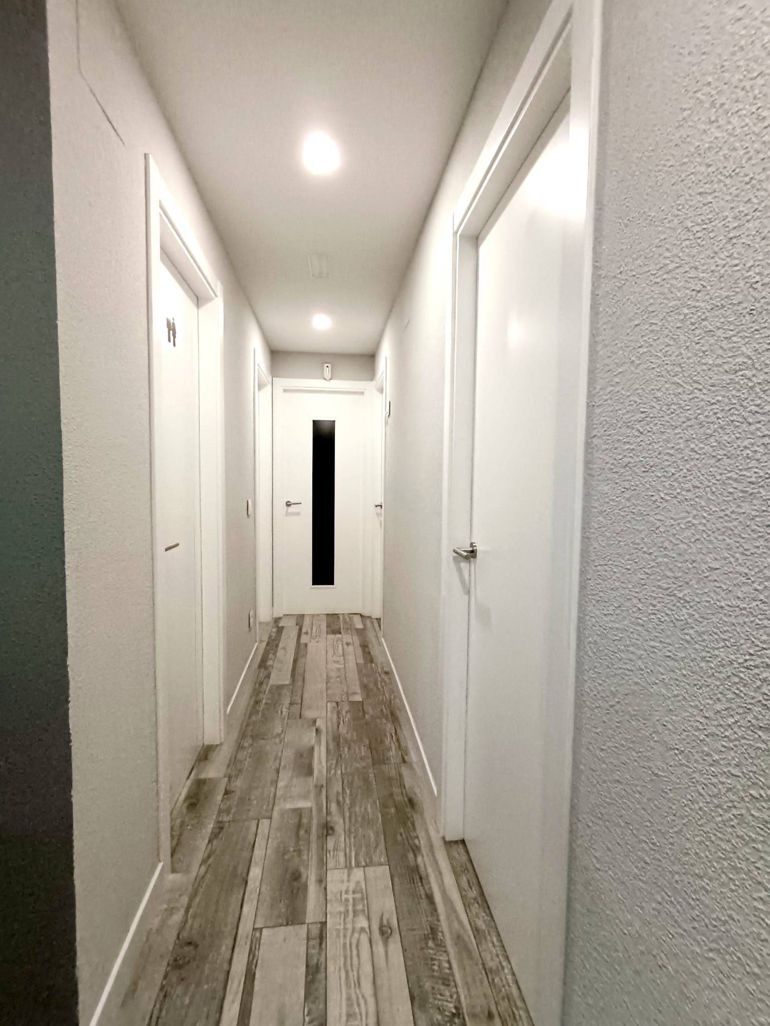 - Puertas de madera y rodapiés lacados en blanco, suelo cerámico, ventanas de PVC y pintura lisa